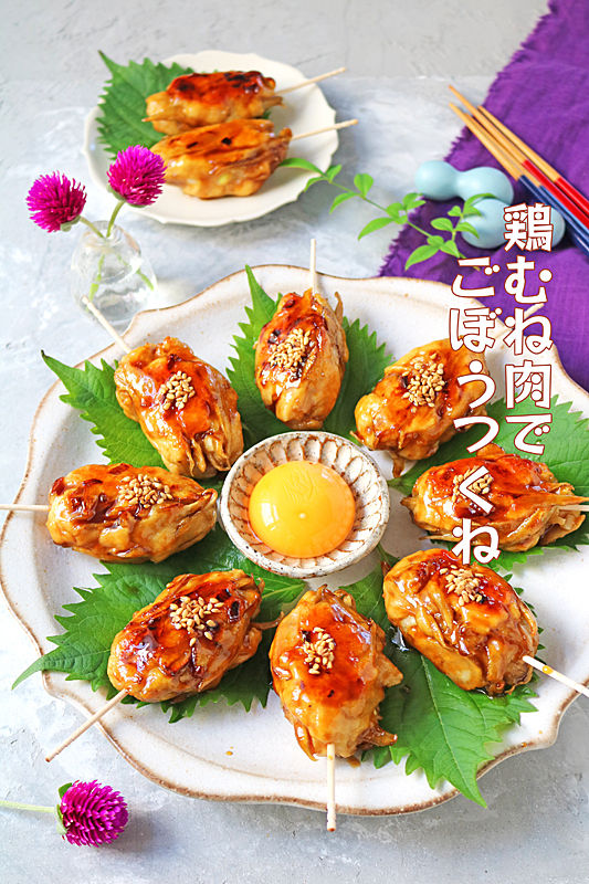こんばんは~!今日は鶏むね肉を刻んで作るごぼうが香ばしいヘルシーつくね♪鶏むね肉をコロコロサイズに刻んで、ごぼうと長ネギを加えて丸め、照り焼···