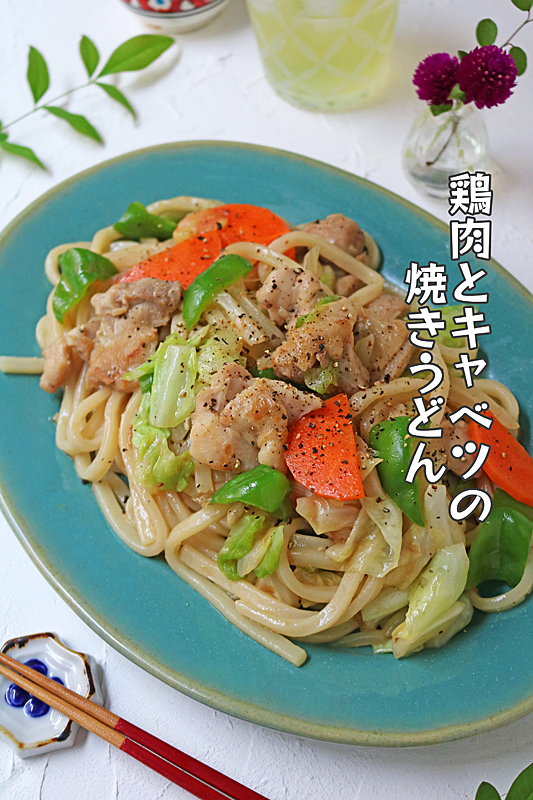 1皿で栄養たっぷり♪鶏肉とキャベツのこくうま焼きうどん♪