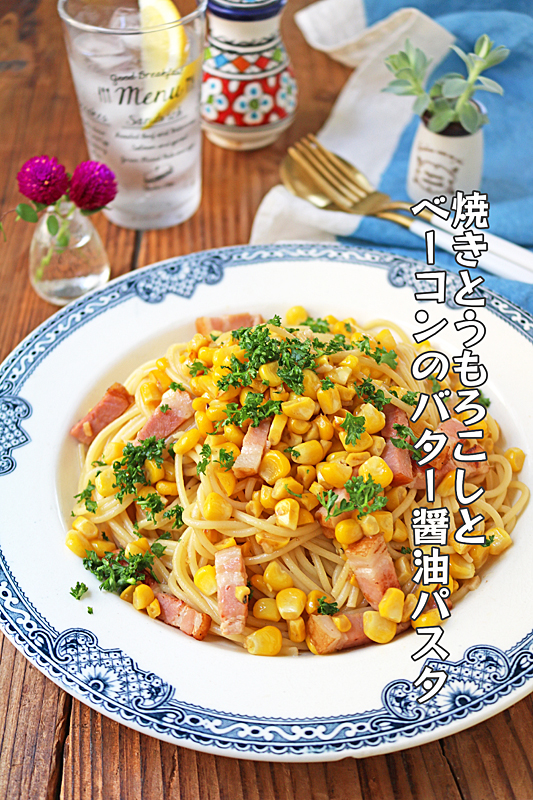 簡単夏休みランチ♪焼きとうもろこしとベーコンのバターしょう油パスタ